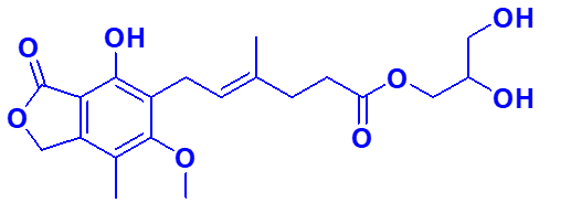 Chemically known as 2,3-Dihydroxypropyl (E)-6-(4-hydroxy-6-methoxy-7-methyl-3-oxo-1,3-dihydroisobenzofuran-5-yl)-4-methylhex-4-enoate, Mycophenolate glycerol ester is essentially the glycerol ester derivative of Mycophenolate.